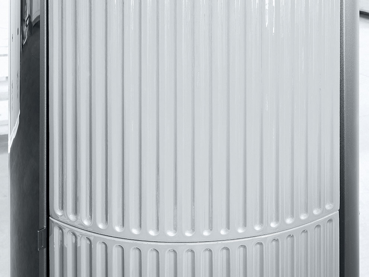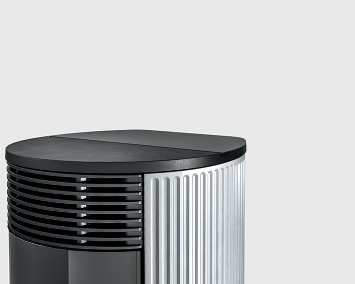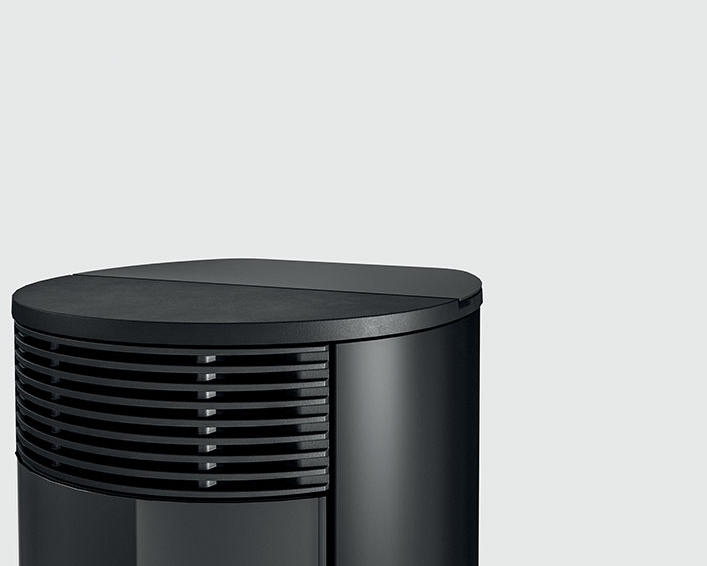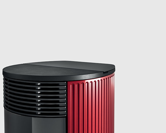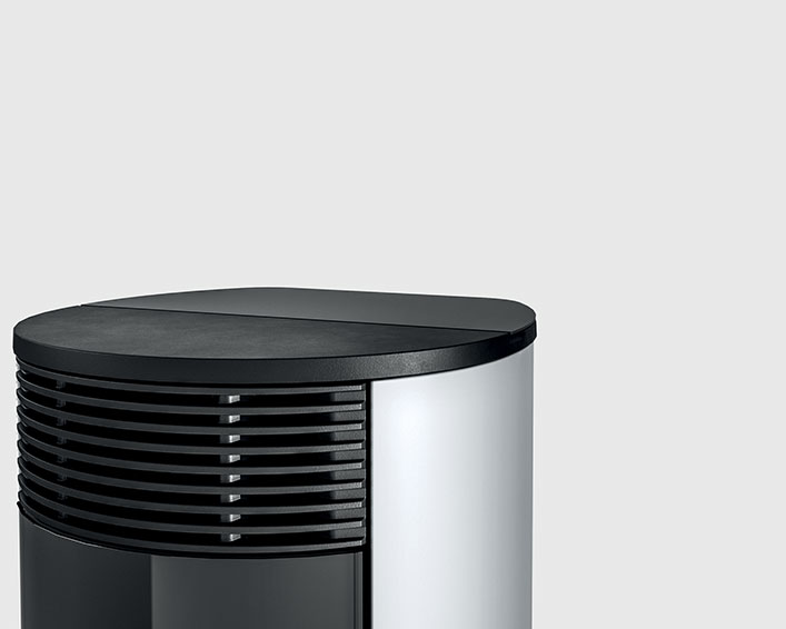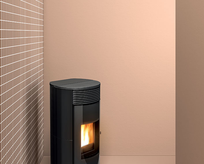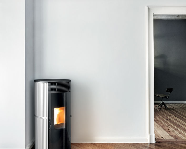 Wasserführender Design-Pelletofen mit runder Form. Er ist mit zwei Leistungen erhältlich: 18 kW, perfekt für Wohnräume mit rund 150 Quadratmetern und 24 kW für Wohnflächen von zirka 220 Quadratmetern. Intelligente Regelung der Verbrennung über die Technologie Maestro und mit zwei WLANs inbegriffen. Die Bedienung erfolgt direkt per Smartphone. Serienmäßig wird auch eine innovative digitale Bedienblende angeboten. Verkleidung aus Keramik mit glatter (Plain White, Plain Black) oder geriffelter (Line White, Line Bordeaux) Oberfläche.