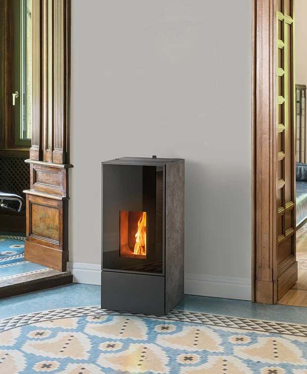 Eiko ist ein kompakter Pelletofen mit natürlicher Konvektion – ideal für kleine Räume. Dank seiner Free-Technologie funktioniert er auch bei Stromausfällen. Der Rauchabzug kann oben oder hinten angebracht werden.