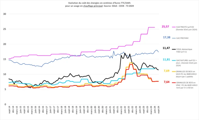 Nous vous invitons à consulter le schéma suivant, que l’association Propellet réalise tous les ans pour comparer les coûts des différents combustibles utilisés en France.