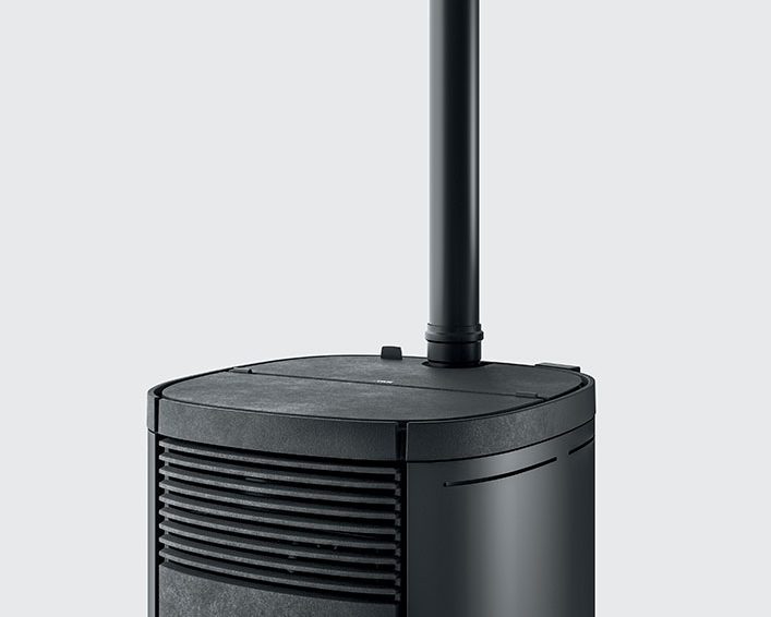 La variante avec l’évacuation des fumées vers la partie supérieure au lieu de vers la partie arrière, est également disponible. Cela permet d’installer le poêle au ras du mur, ce qui réduit l’encombrement en profondeur tout en optimisant l’espace habitable.